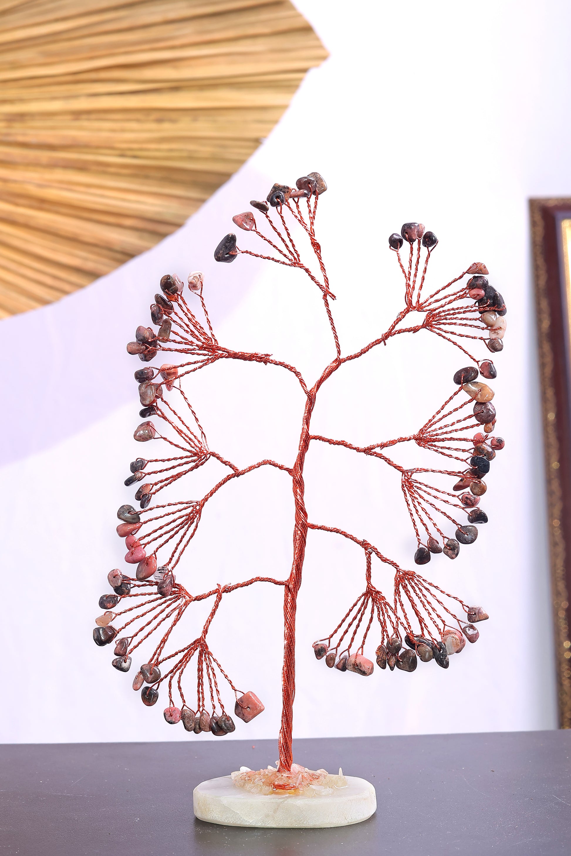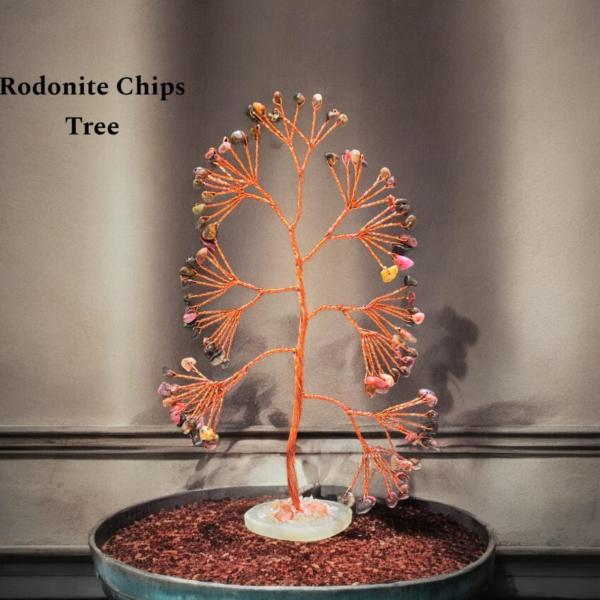 Adorned with Rhodonite gemstone slices, the crystal tree amplifies its healing properties by focusing on emotional healing and personal transformation.