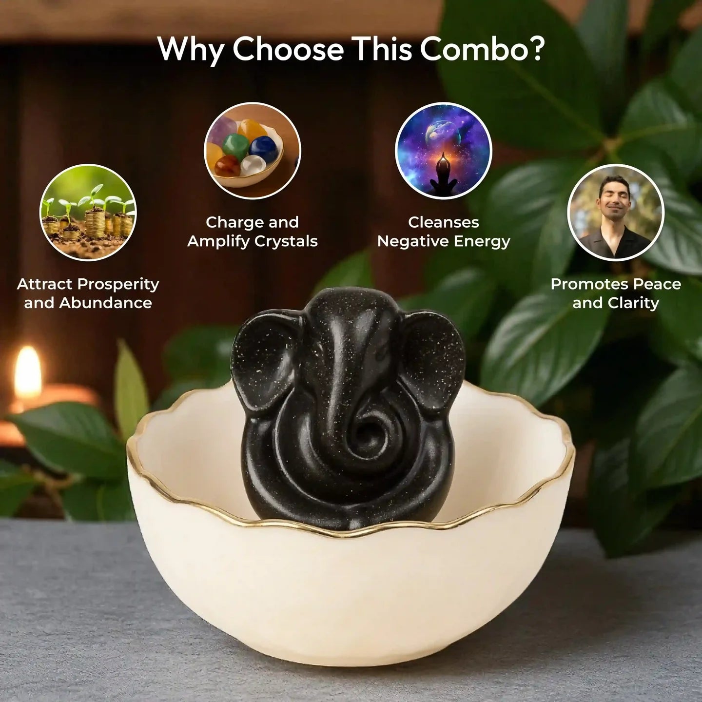Ganesh Ji represents wisdom, abundance, and the removal of obstacles. When paired with a selenite bowl, this set becomes a powerful tool for attracting financial growth, luck, mental clarity, and spiritual harmony. Pyrite is often called a “money magnet,” making this combination ideal for anyone looking to manifest wealth and positivity.