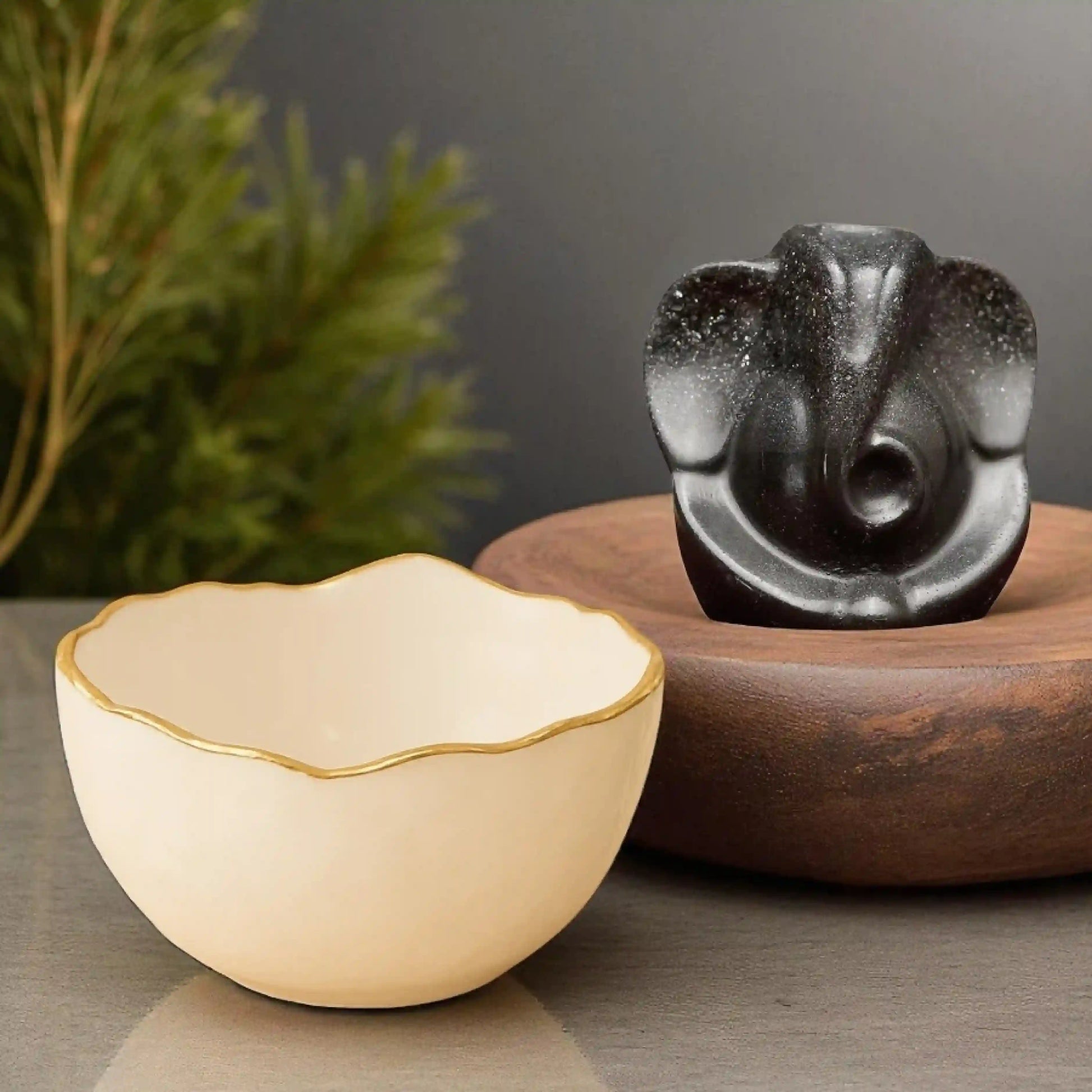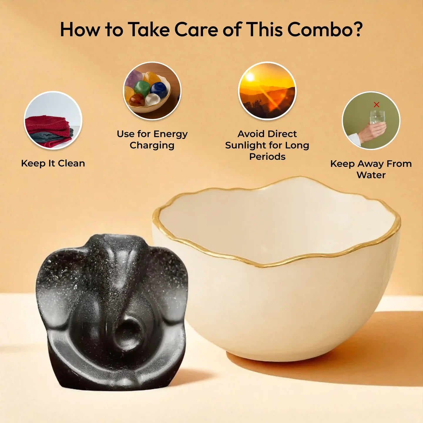 Complementing the bowl is the Pyrite Ganesh Ji Idol, crafted using authentic pyrite dust mixed with a small amount of resin to maintain its detailed shape. This ensures durability while preserving the natural grounding and prosperity-enhancing energy of pyrite.
